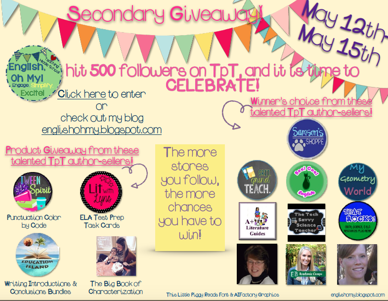 I’m super excited to be a part of another GIVEAWAY, hosted by English, Oh My!  Several middle school and elementary TPT seller-authors have teamed up to giveaway our products.  What a great way to end the school year with a bang, as well as have some amazing activities for the start of the 2016-17 school year!