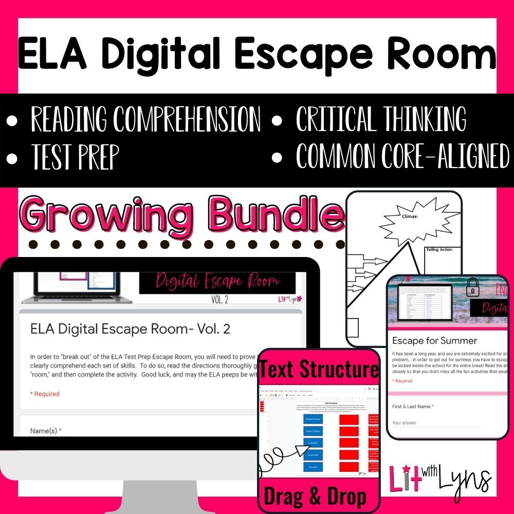 4. Lastly, nothing helps the stressed out teacher more than resources that are ZERO PREP! I realized this when I started creating my own escape rooms. Many come in digital and printable format. If you’re looking for no prep, the digital escape rooms are easiest. You simply share the link with your students, and they are on their way. I have escape rooms that cover virtually every topic for the ELA classroom. Check out my Reading Comprehension & Grammar Escape Room Growing Bundle. Also, you can purchase them individually, but you save 20% by purchasing the bundle.