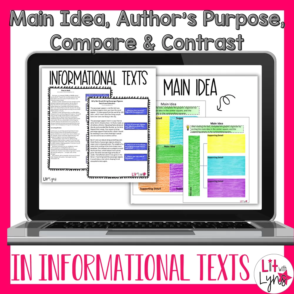 Students will determine the main idea, supporting details, author’s purpose, and compare and contrast in informational texts. This resource comes in both printable and digital format. Perfect for distance learning, flipped classroom, blending learning, or face-to-face instruction.