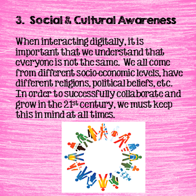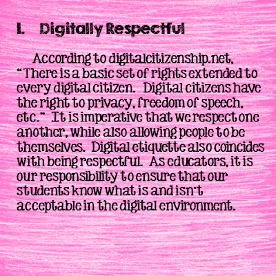 As I work toward completing the online training necessary in order to teach in a virtual environment, I have been asked to address 3 qualities associated with exemplary digital citizens. Through my experience as an online college instructor, as well as incorporating daily digital assignments through Google Classroom, I have learned just how important it is to be an exemplary digital citizen. The three qualities I feel are most significant: being digitally respectful, being digitally responsible, and being socially and culturally aware. These are traits I have encouraged in all of my students and feel that it’s imperative that our generation implement these behaviors at all possible times.